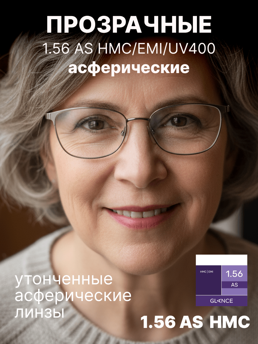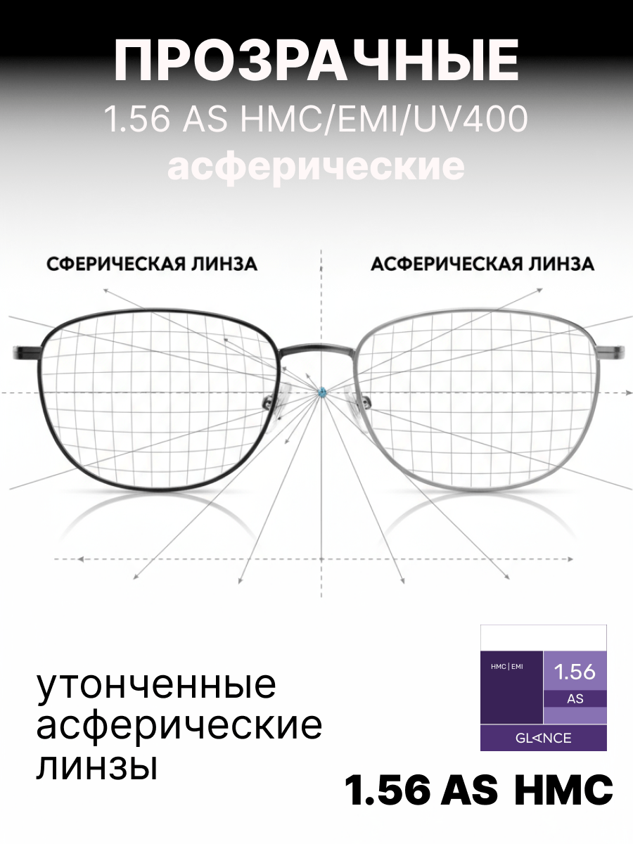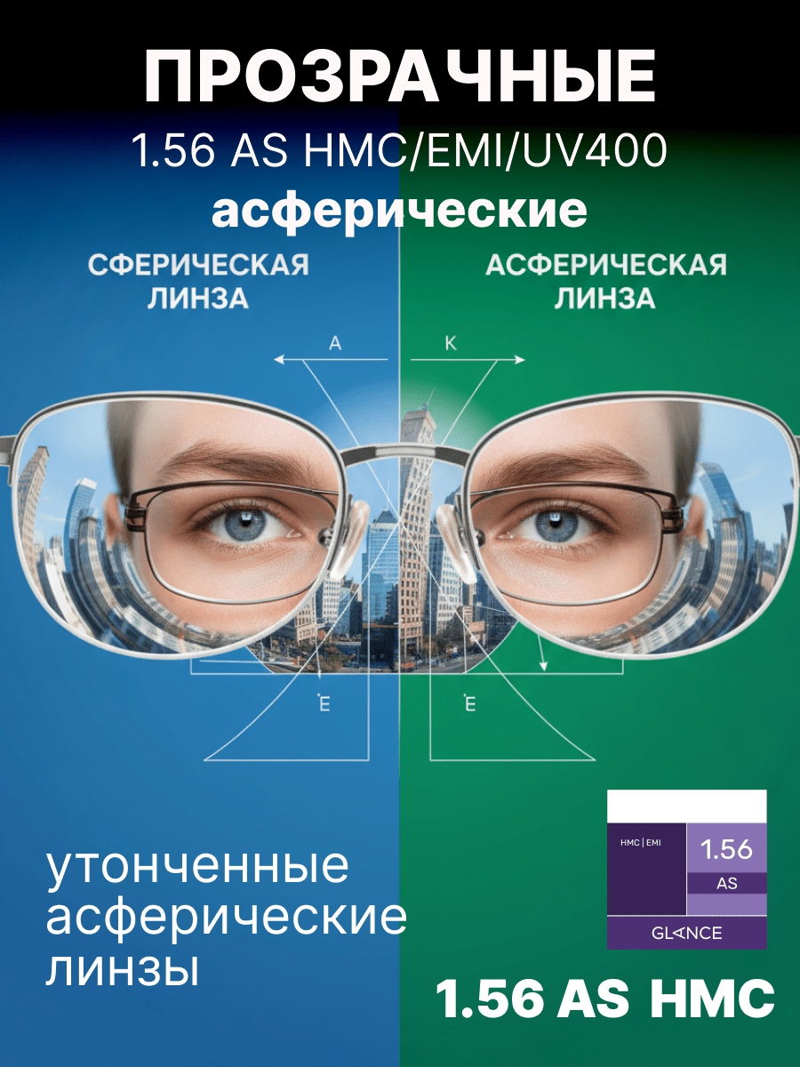 Более тонкая, чем обычная полимерная, линза Glance 1,56 AS HMC EMI изготовлена из материала с повышенным коэффициентом преломления ne = 1,56. Эта линза имеет асферический (AS) дизайн и вследствие этого минимальные краевые искажения. Таким образом достигается качественная передача изображения по всему полю зрения вплоть до края линзы. Близко расположенная к глазу плоская внутренняя поверхность линзы обеспечивает более естественную передачу размера глаза за линзой и изображения окружающих предметов для пользователей. Сама линза тоньше и легче соответствующей сферической линзы. EMI-покрытие — специальное двустороннее металлизированное покрытие, блокирующее электромагнитные волны. Это покрытие обеспечивает защиту от вредного излучения компьютера, телевизора и другой электронной аппаратуры. Высокая степень защиты от ультрафиолетового излучения: 100% UV-B и 97% UV-A.Характеристики линз