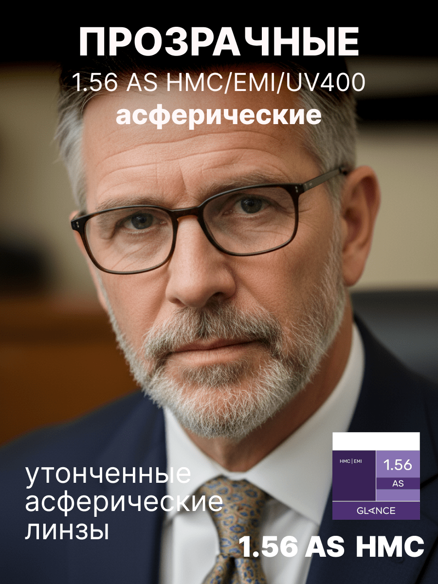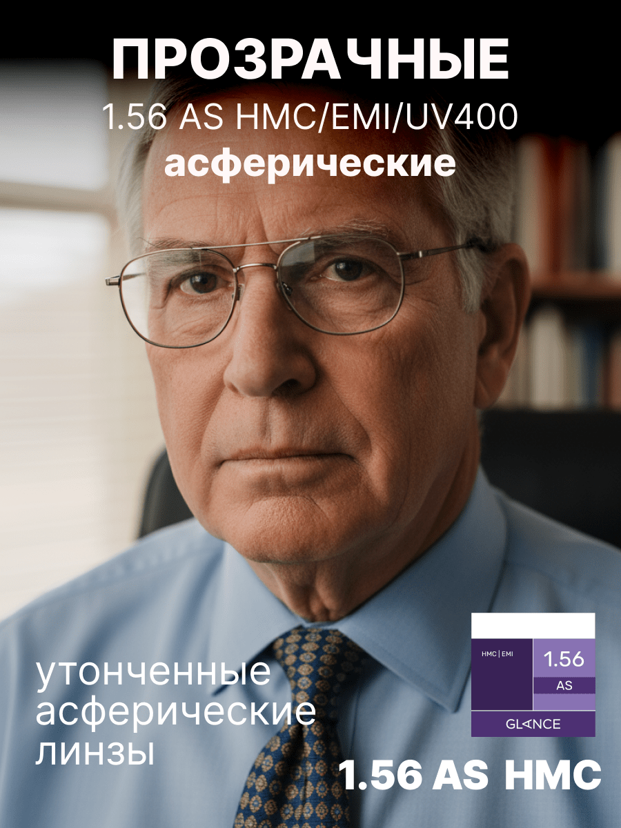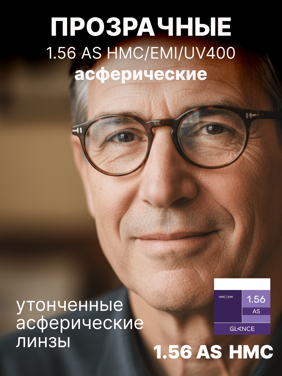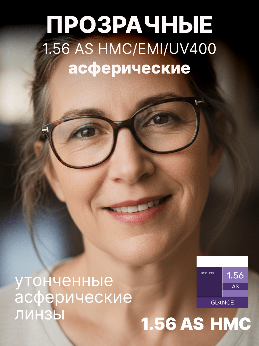 Более тонкая, чем обычная полимерная, линза Glance 1,56 AS HMC EMI изготовлена из материала с повышенным коэффициентом преломления ne = 1,56. Эта линза имеет асферический (AS) дизайн и вследствие этого минимальные краевые искажения. Таким образом достигается качественная передача изображения по всему полю зрения вплоть до края линзы. Близко расположенная к глазу плоская внутренняя поверхность линзы обеспечивает более естественную передачу размера глаза за линзой и изображения окружающих предметов для пользователей. Сама линза тоньше и легче соответствующей сферической линзы. EMI-покрытие — специальное двустороннее металлизированное покрытие, блокирующее электромагнитные волны. Это покрытие обеспечивает защиту от вредного излучения компьютера, телевизора и другой электронной аппаратуры. Высокая степень защиты от ультрафиолетового излучения: 100% UV-B и 97% UV-A.Характеристики линз