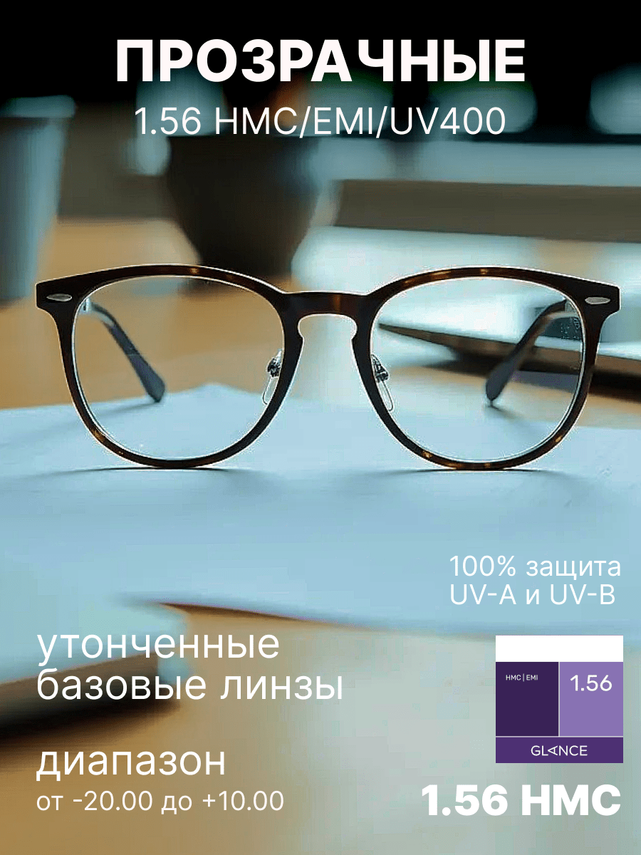 Более тонкая, чем обычная полимерная, линза Glance 1,56 HMC EMI изготовлена из материала с повышенным коэффициентом преломления ne = 1,56. EMI - покрытие — специальное двустороннее металлизированное покрытие, блокирующее электромагнитные волны. Это покрытие обеспечивает защиту от вредного излучения компьютера, телевизора и другой электронной аппаратуры. Высокая степень защиты от ультрафиолетового излучения: 100% UV-B и 97% UV-A.