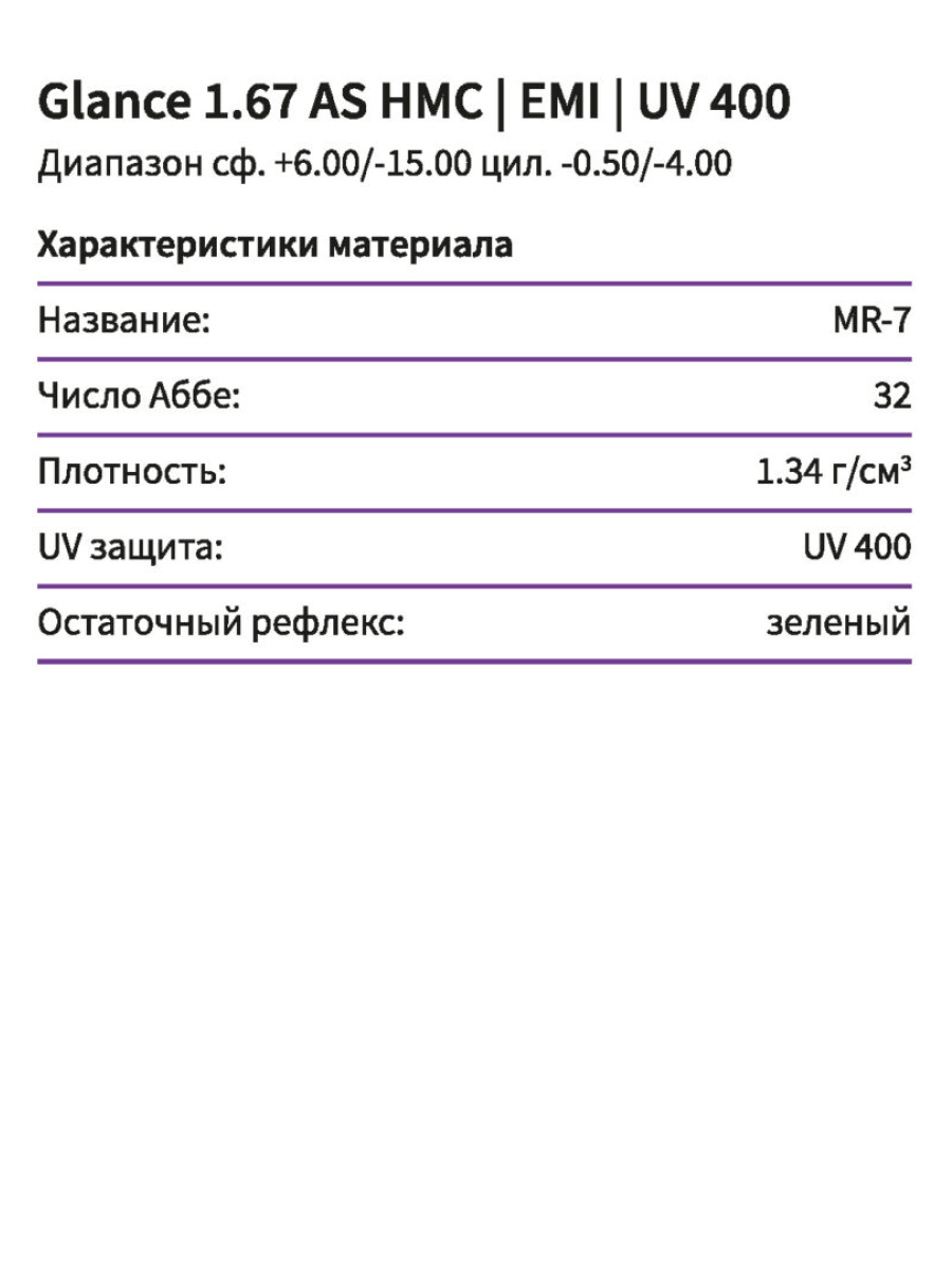 Очень тонкая линза Glance 1,67 AS HMC EMI UV 400 изготовлена из материала с очень высоким коэффициентом преломления ne = 1,67. Эта линза имеет асферический (AS) дизайн и вследствие этого минимальные краевые искажения. Таким образом, достигается качественная передача изображения по всему полю зрения вплоть до края линзы. Близко расположенная к глазу плоская внутренняя поверхность линзы обеспечивает более естественную передачу размера глаза за линзой и изображения окружающих предметов для пользователя. EMI-покрытие — специальное двустороннее металлизированное покрытие, блокирующее электромагнитные волны. Это покрытие обеспечивает защиту от вредного излучения компьютера, телевизора и другой электронной аппаратуры. UV-400 — Специальное покрытие полностью поглощает ультрафиолет в диапазонах UV-B и UV-A вплоть до 400 нм, что обеспечивает максимальную защиту от ультрафиолета.Характеристики линз