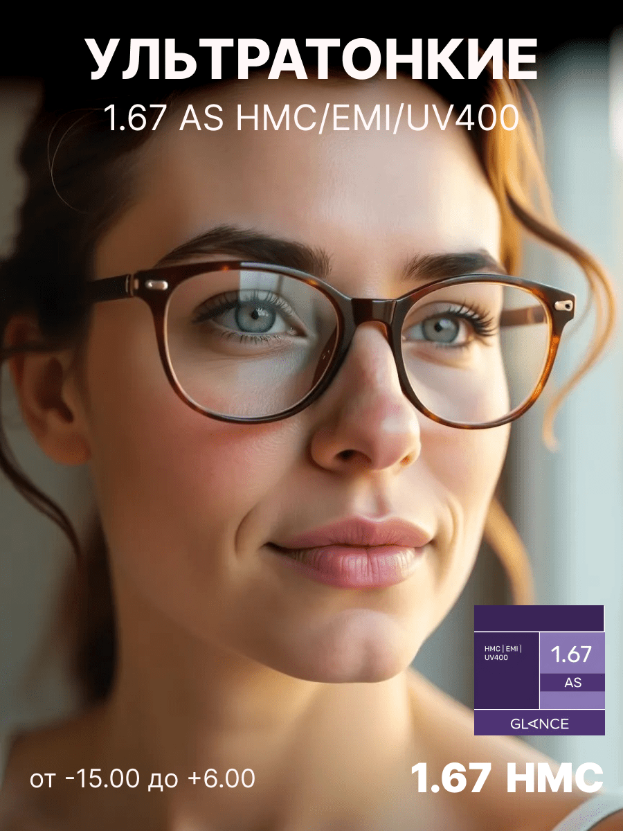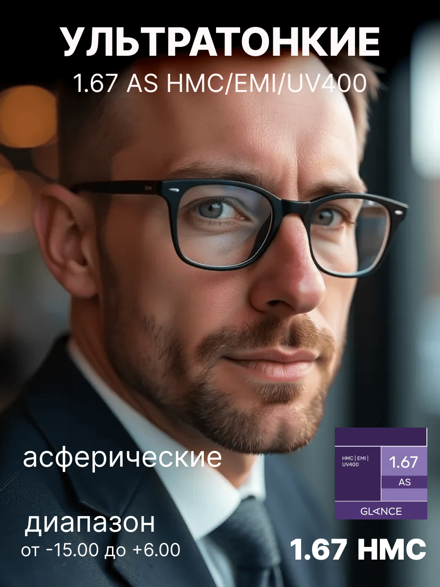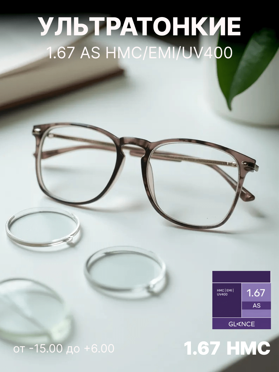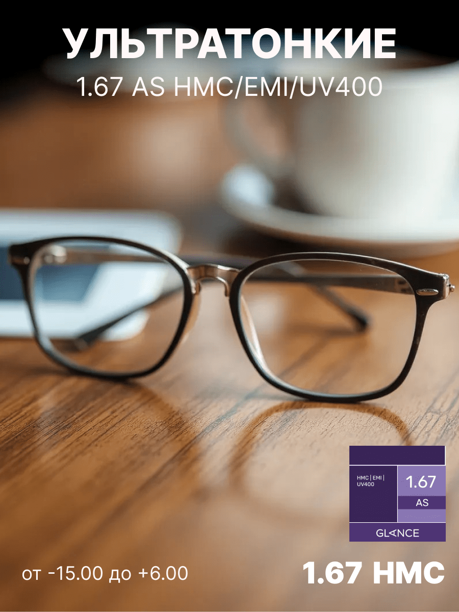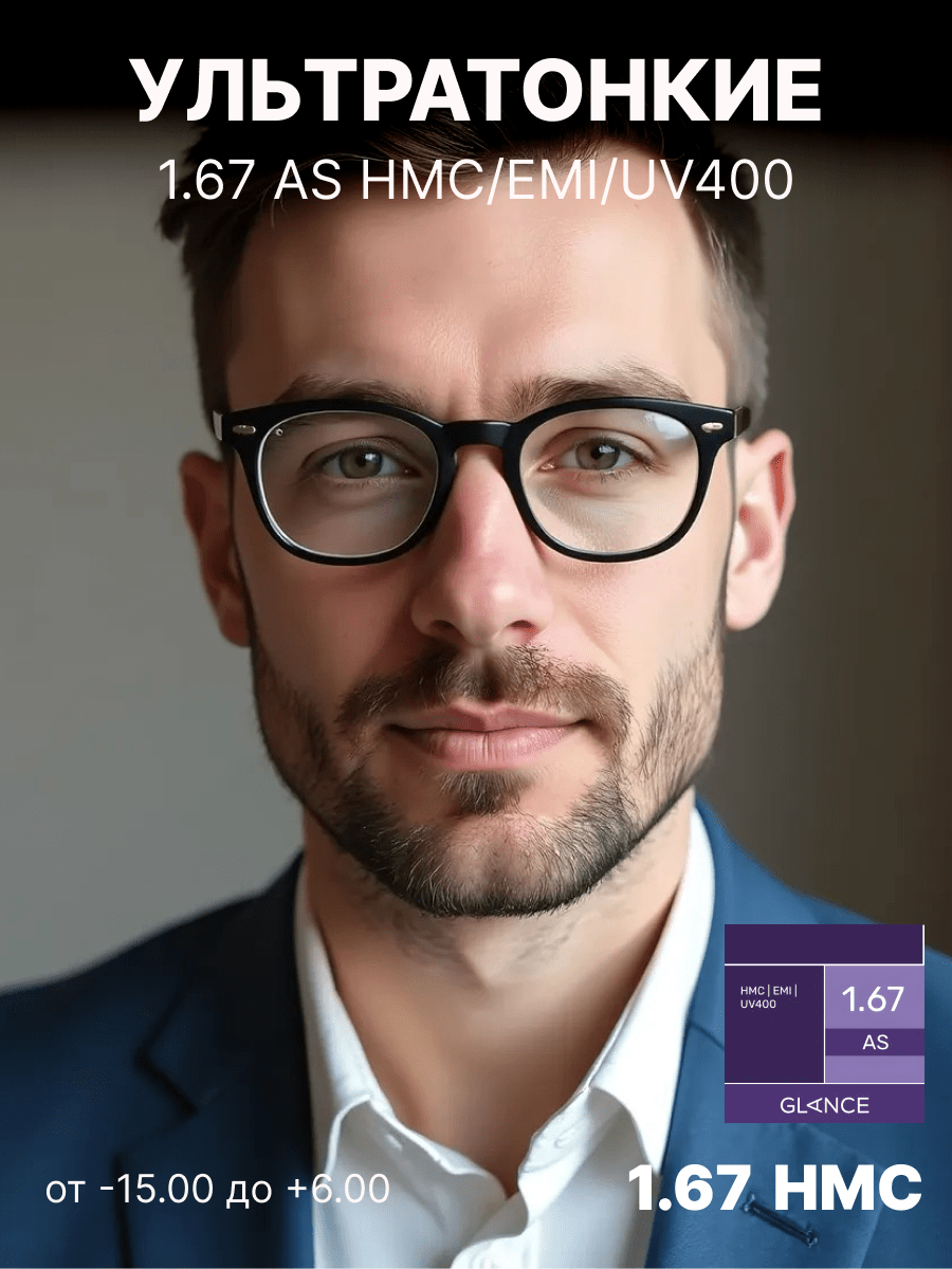 Очень тонкая линза Glance 1,67 AS HMC EMI UV 400 изготовлена из материала с очень высоким коэффициентом преломления ne = 1,67. Эта линза имеет асферический (AS) дизайн и вследствие этого минимальные краевые искажения. Таким образом, достигается качественная передача изображения по всему полю зрения вплоть до края линзы. Близко расположенная к глазу плоская внутренняя поверхность линзы обеспечивает более естественную передачу размера глаза за линзой и изображения окружающих предметов для пользователя. EMI-покрытие — специальное двустороннее металлизированное покрытие, блокирующее электромагнитные волны. Это покрытие обеспечивает защиту от вредного излучения компьютера, телевизора и другой электронной аппаратуры. UV-400 — Специальное покрытие полностью поглощает ультрафиолет в диапазонах UV-B и UV-A вплоть до 400 нм, что обеспечивает максимальную защиту от ультрафиолета.Характеристики линз