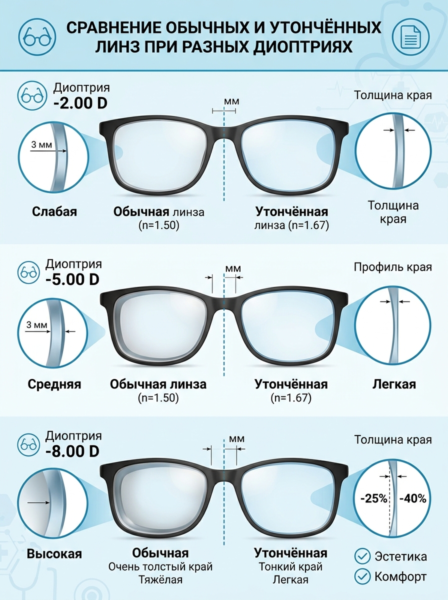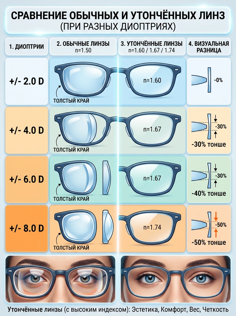 Полимерные асферические сверхутонченные линзы с упрочняющим, многослойным просветляющим, водоотталкивающим и антистатическим покрытиями, УФ-защитой, защитой от вредного электромагнитного излучения.