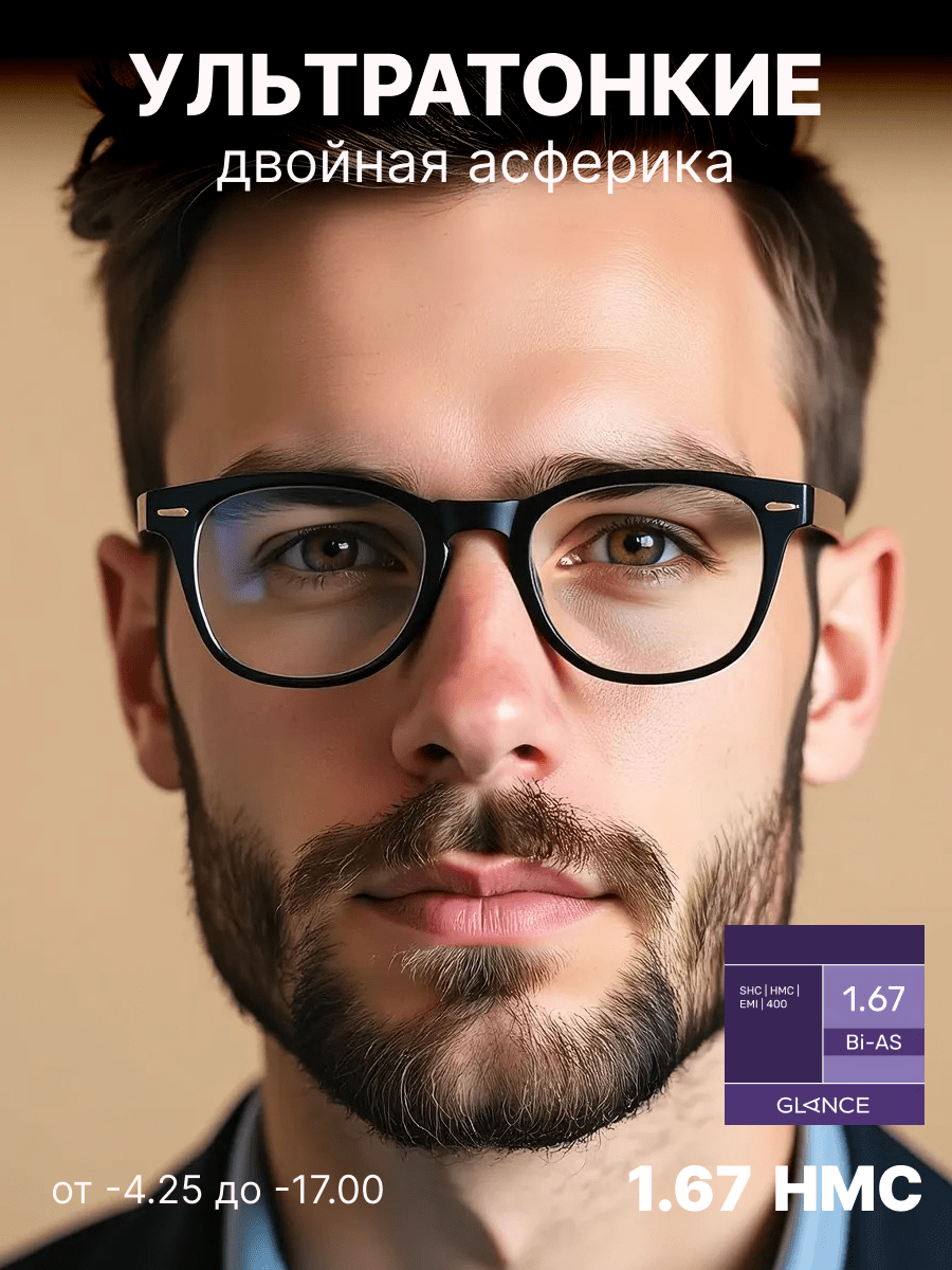 Очень тонкая линза Glance 1.67 Bi-AS Super Hydrophobic Coated HMC/EMI/UV 400 изготовлена из материла с очень высоким коэффициентом преломления ne=1,67. Линза имеет асферический дизайн на обеих поверхностях, а не только на передней. Эта, так называемая, Би-асферическая (Bi-As) линза характеризуется минимальными краевыми искажениями. Таким образом, достигается качественная передача изображения по всему полю зрения вплоть до края линзы. Близко расположенная к глазу плоская внутренняя поверхность линзы обеспечивает более естественную передачу размера глаза за линзой и изображения предметов для пользователя. Дополнительное покрытие Super Hydrophobic Coated обеспечивает особо высокие водоотталкивающие свойства поверхности линзы. EMI- покрытие – специальное двустороннее металлизированное покрытие, блокирующее электромагнитные волны. Это покрытие обеспечивает защиту от вредного излучения компьютера, телевизора и другой электронной аппаратуры. UV-400 – специальное покрытие полностью поглощает ультрафиолет и диапа-зонах UV-B и UV-A вплоть до 400 нм, что обеспечивает максимальную защиту от ультрафиолета.Характеристики линз