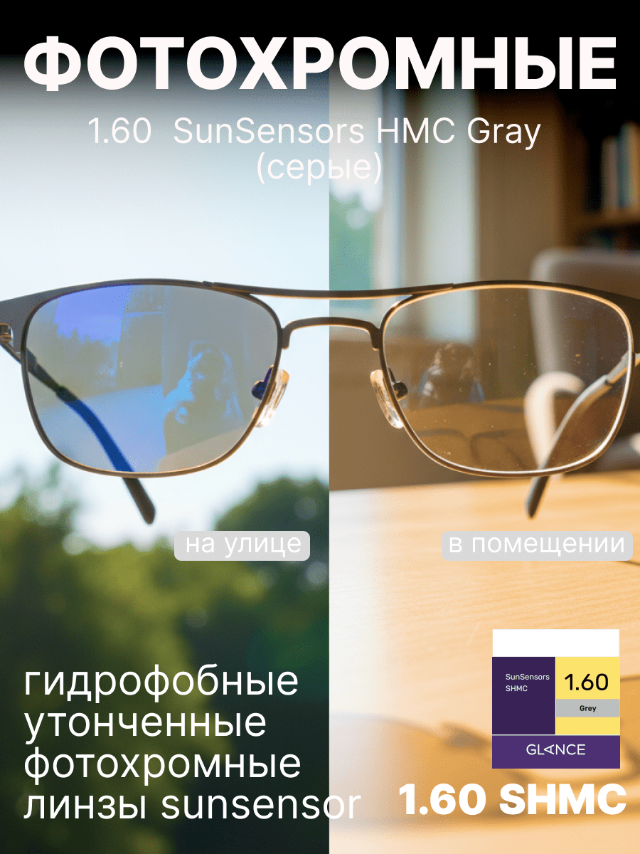- Эти линзы подходят для любых типов оправ и рекомендованы для повседневного использования, особенно для активных людей, ценящих комфорт и здоровье своих глаз. Выбирая Glance 1.60 SunSensor, вы получаете современный продукт, созданный с использованием передовых технологий в области оптики.