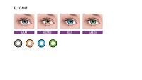 В серии Adria Elegant представлены 4 варианта цвета: blue, brown, gray, green. В упаковке поставляются 2 линзы, рассчитанные на 3 месяца дневного ношения.