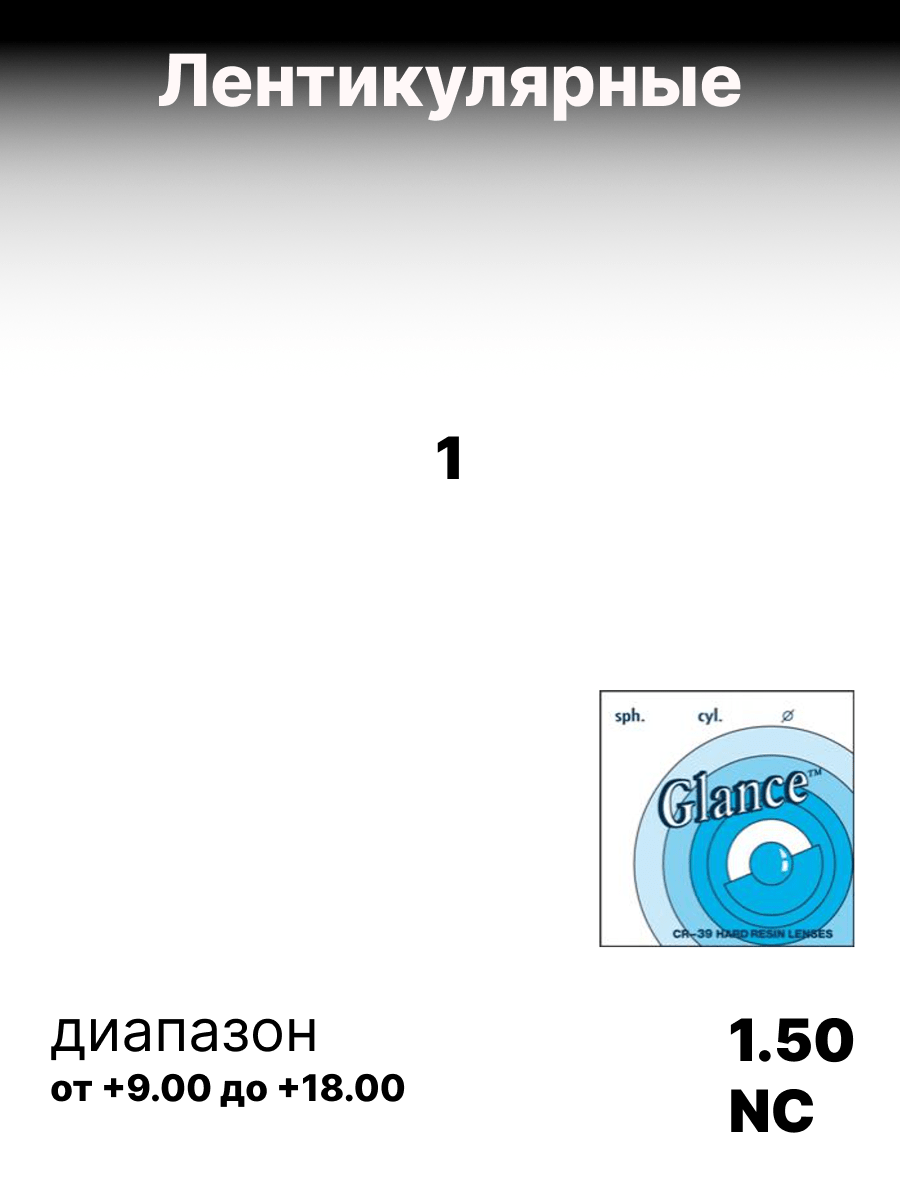 Лентикулярные полимерные линзы Glance 1.50 Lenticular изготовлены из органического полимера CR-39 со стандартным коэффициентом преломления ne=1,50. Передняя поверхность линз в лентикулярном дизайне Omega (Ω) состоит из центральной оптической зоны, окруженной более тонкой и плоской периферийной зоной. Кривизна передней поверхности определяет ее оптическую силу. Лентикулярный дизайн позволяет резко уменьшить толщину и вес линз, особенно у положительных очковых линз. Малая плотность, бесцветность и прозрачность линз позволяет легко производить окраску.