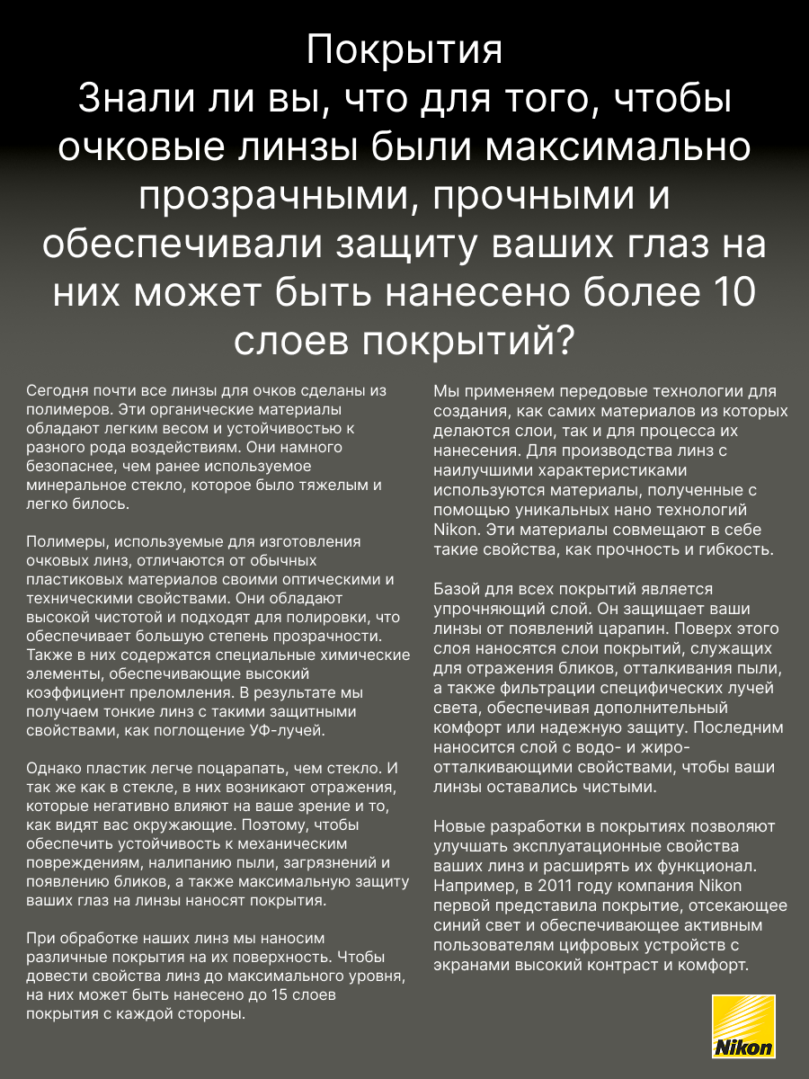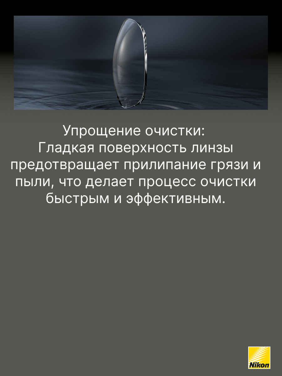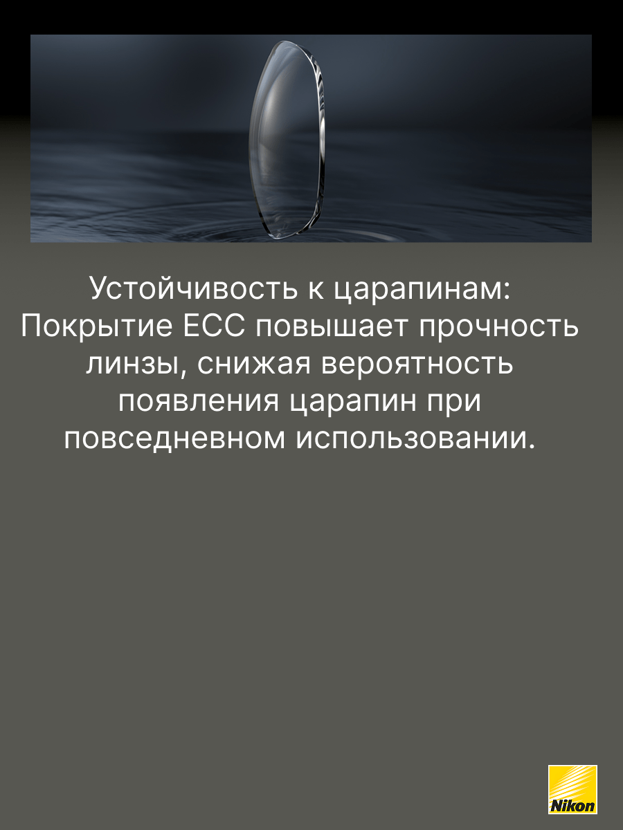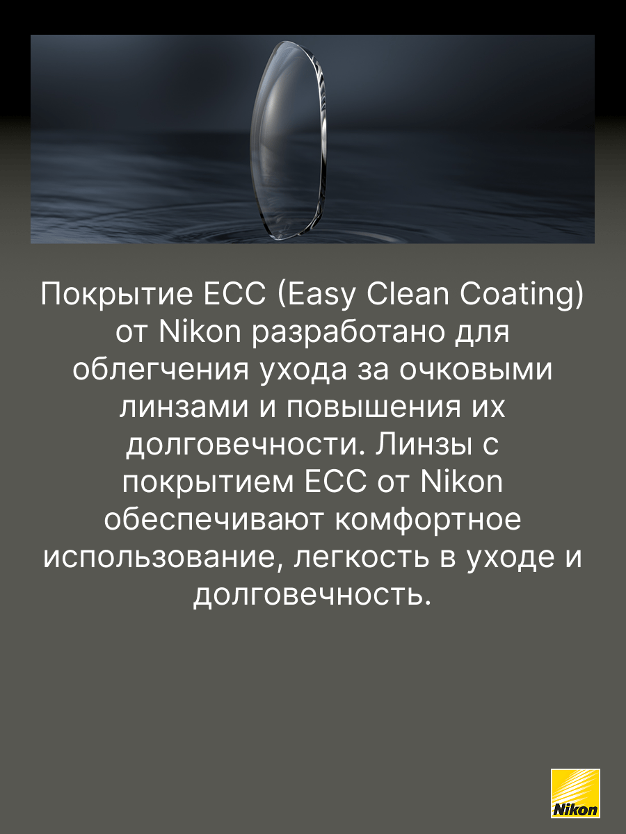 Покрытие Easy Clean Coating (ECC) создано специально для того, чтобы облегчить пользователям очков уход за линзами, особенно в сравнении с линзами, имеющими стандартное покрытие. Это стало возможным благодаря применению передовых технологий Nikon. Рекомендовано для пользователей, кто впервые приобретает очки и желает получить качественное покрытие, которое легко очищается, обладает просветляющими и упрочняющими свойствами.