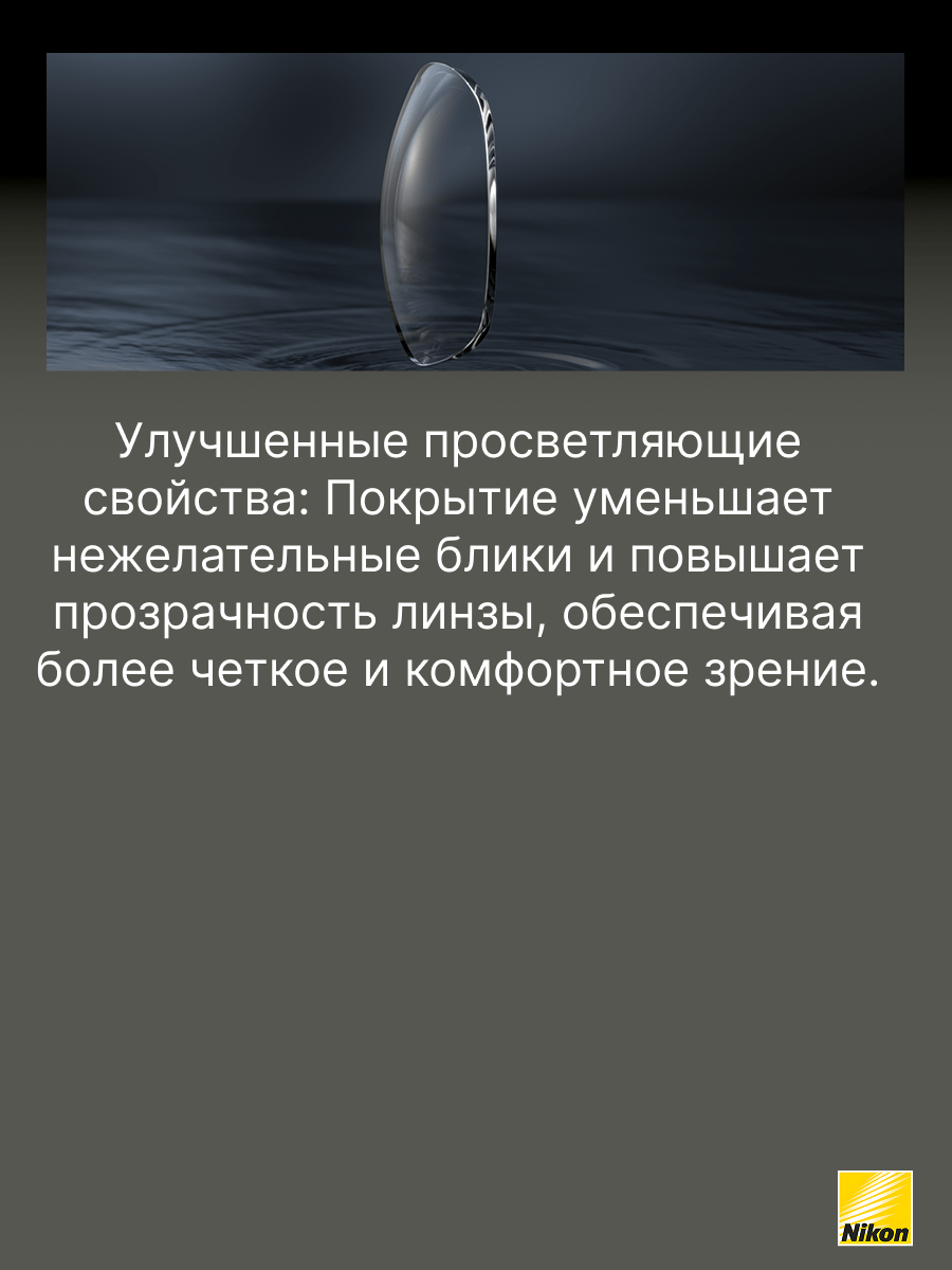 Утонченные однофокальные линзы Nikon Lite 1,60 с многофункциональным покрытием Easy Clean Coat до 30% тоньше и легче, чем обычные линзы из материала 1.50. До 25% более плоские, чем линзы стандартного дизайна из материала 1.50. Покрытие Easy Clean Coat гарантирует простоту ухода и долгий срок службы линз. Обеспечивает 100% защиту от УФ излучения (400 нм.).
