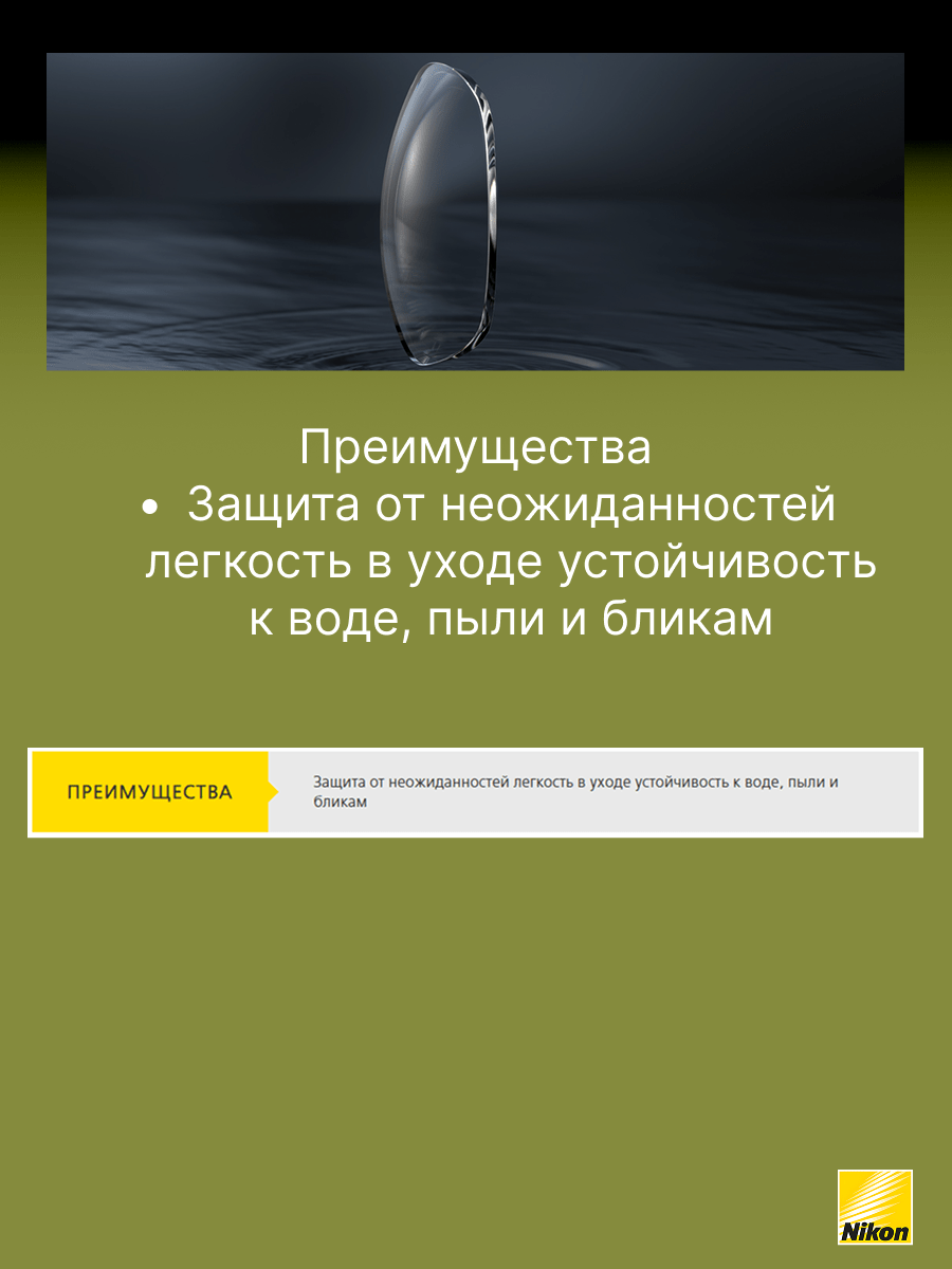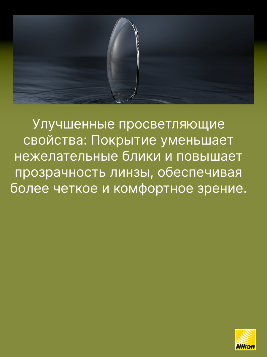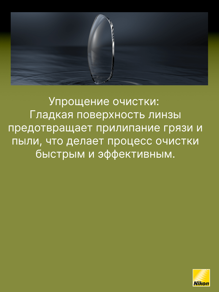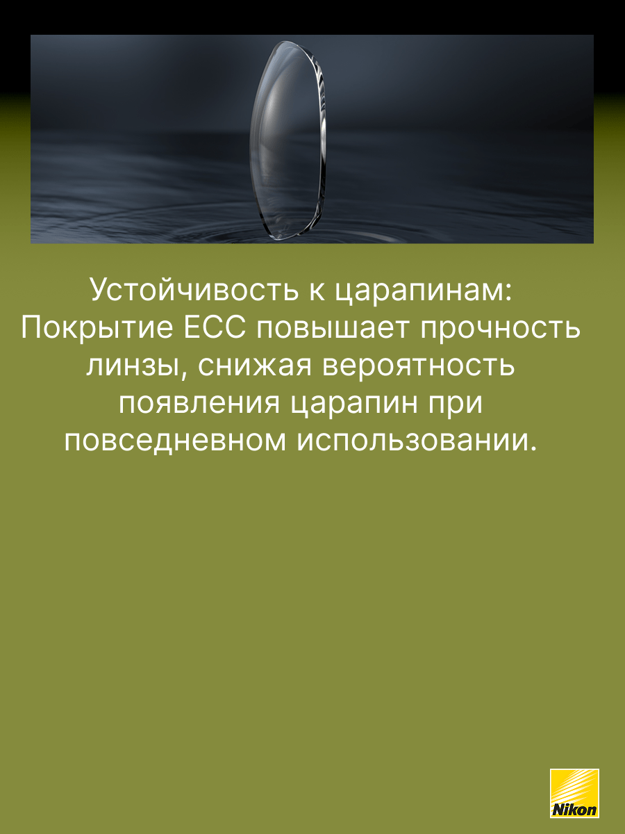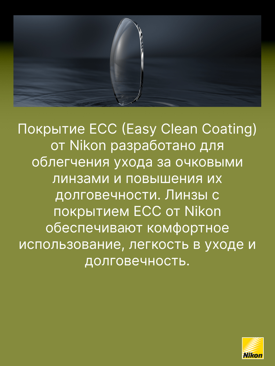 Покрытие Easy Clean Coating (ECC) создано специально для того, чтобы облегчить пользователям очков уход за линзами, особенно в сравнении с линзами, имеющими стандартное покрытие. Это стало возможным благодаря применению передовых технологий Nikon. Рекомендовано для пользователей, кто впервые приобретает очки и желает получить качественное покрытие, которое легко очищается, обладает просветляющими и упрочняющими свойствами.