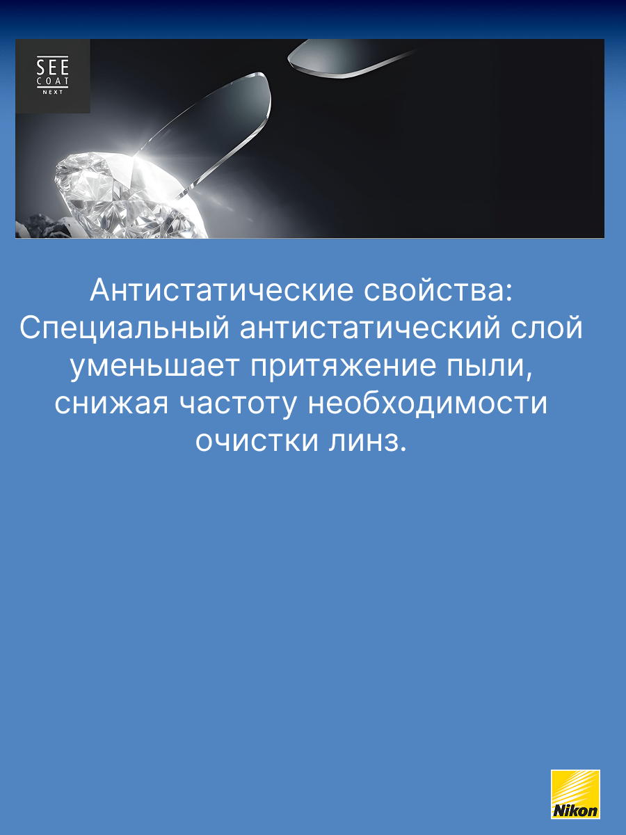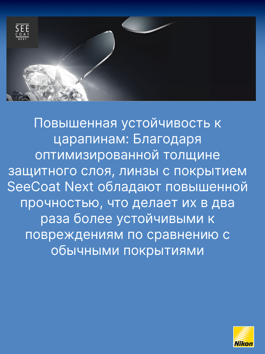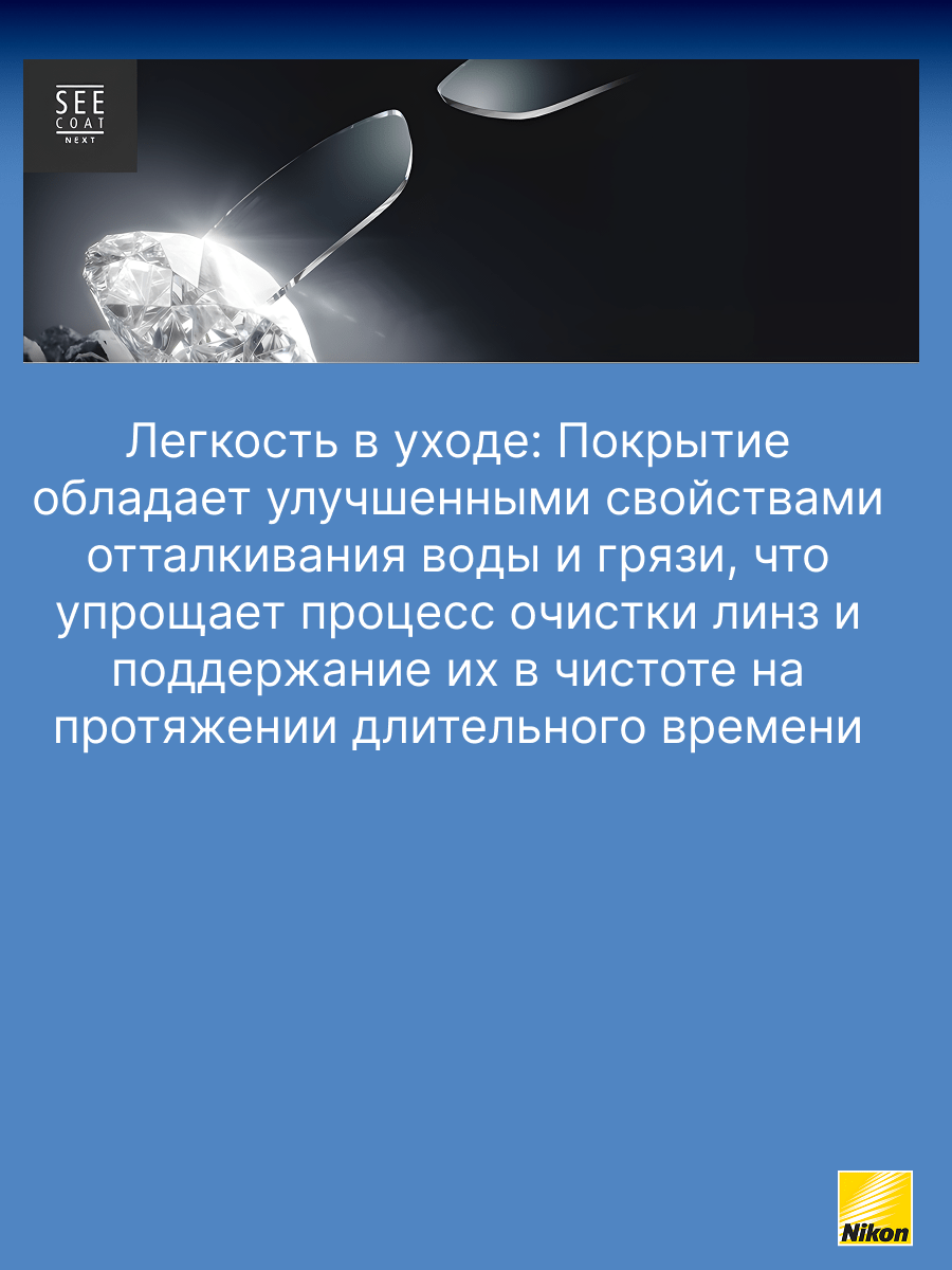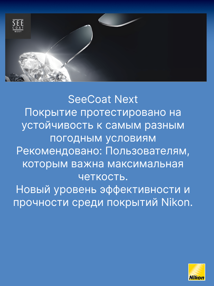 - SeeCoat Next от Nikon — это выбор для тех, кто ценит идеальную чистоту, высокой качество зрения и долговечность линз своих очков.
