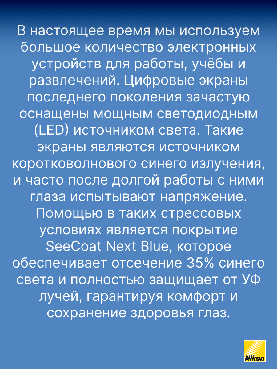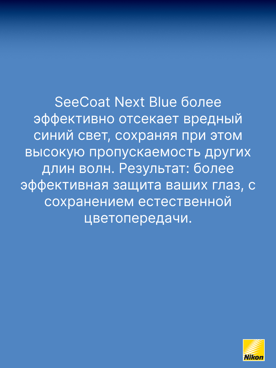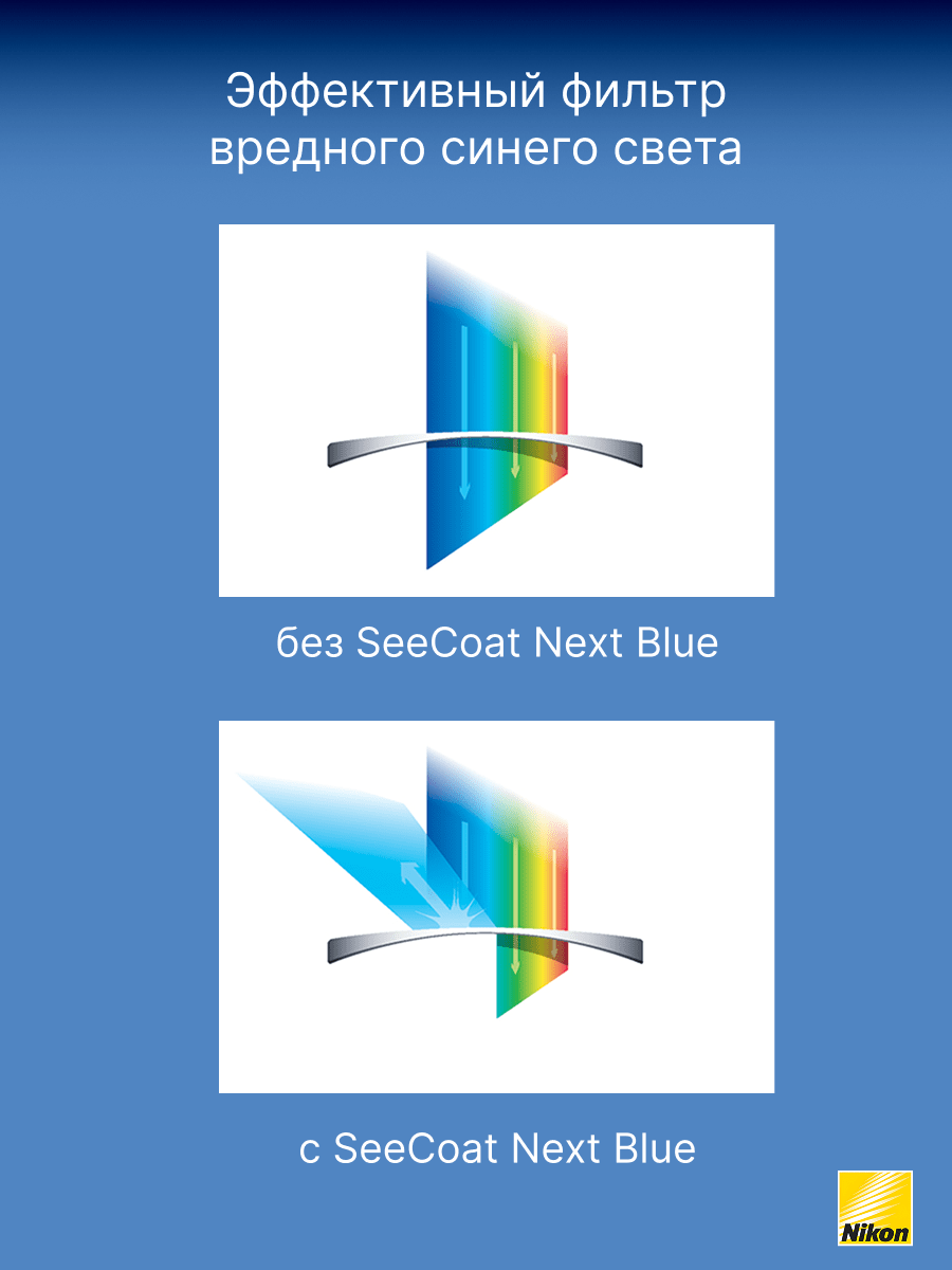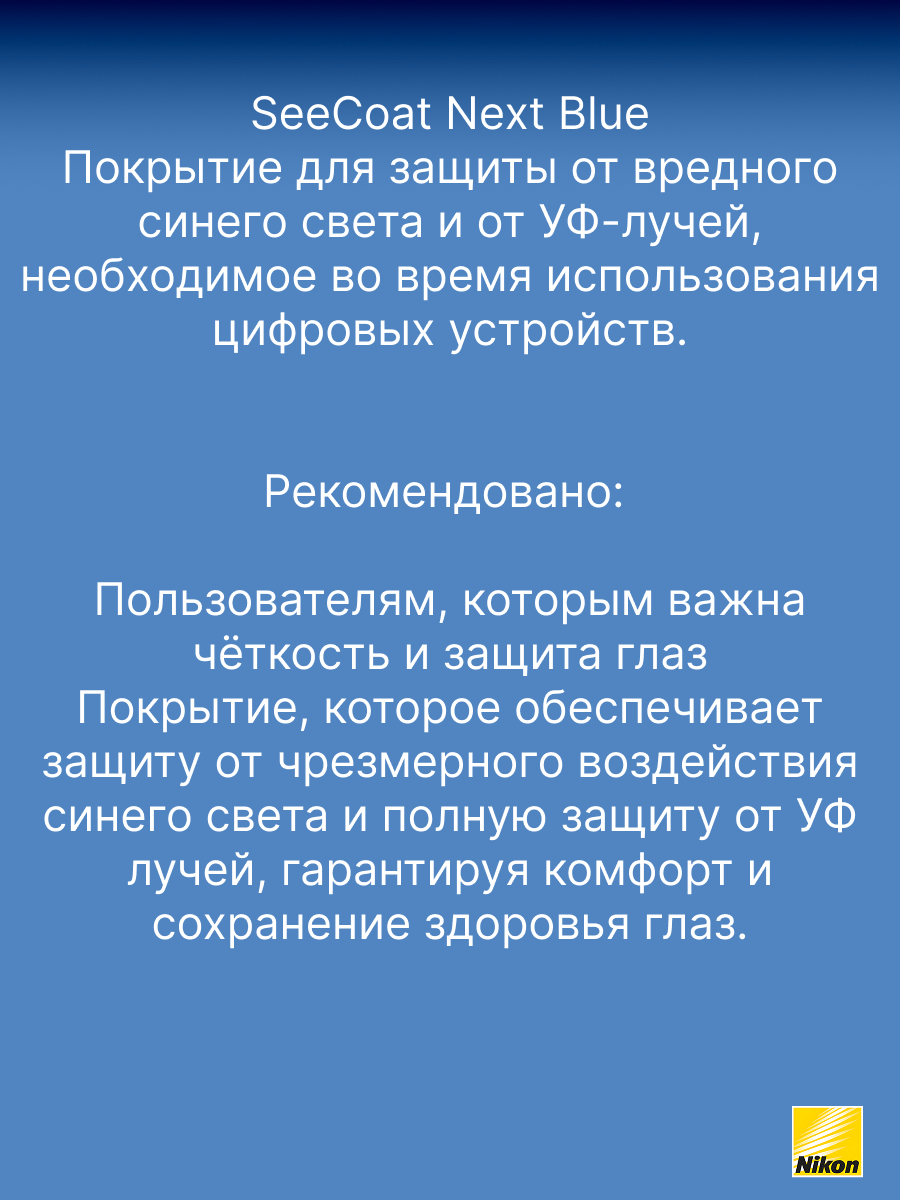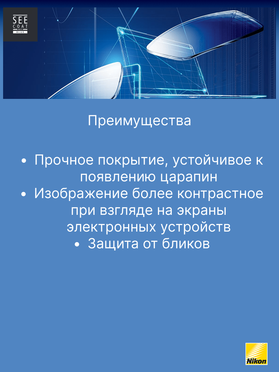 - SeeCoat Next от Nikon — это выбор для тех, кто ценит идеальную чистоту, высокой качество зрения и долговечность линз своих очков.