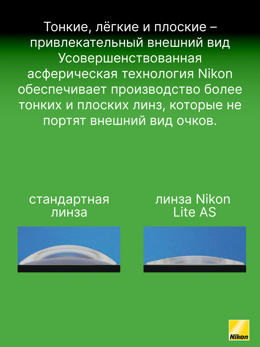 Тонкие однофокальные линзы двойного асферического дизайна Nikon Lite DAS 1,60 с покрытием Seecoat Plus UV обеспечивают четкое зрение и обладают потрясающим внешним видом. До 30% тоньше и до 30% легче, чем обычные линзы из материала 1.50. До 30% более плоские, чем линзы стандартного дизайна из материала 1.50. Благодаря технологии асферизации Вы в меньшей степени ощущаете изменение размеров окружающих предметов, а размер глаз выглядит более естественно. Многофункциональное покрытие SeeСoat Plus UV гарантирует бескомпромиссный зрительный комфорт, простоту ухода и долгий срок службы линз. Обеспечивает 100% защиту от УФ излучения (400 нм.) Срок поставки до Москвы 7 рабочих дней.