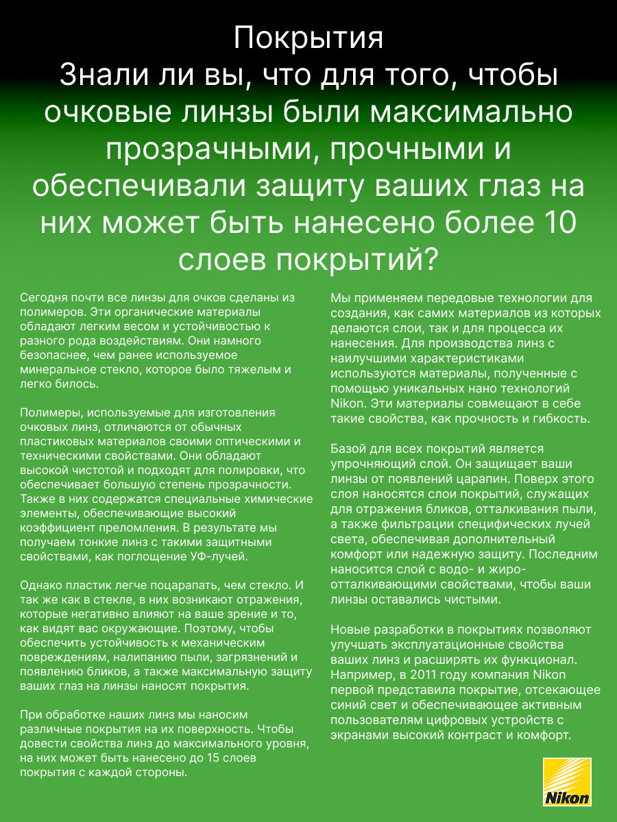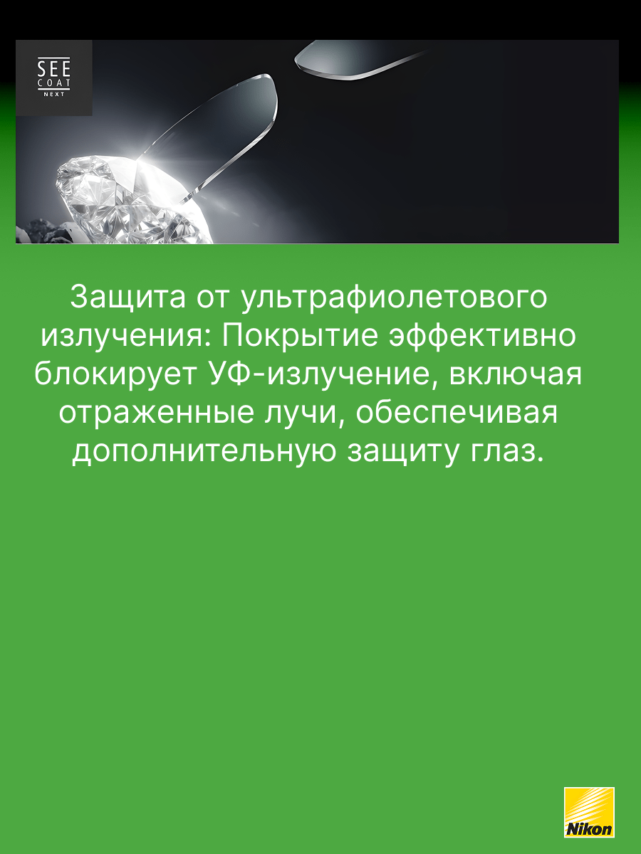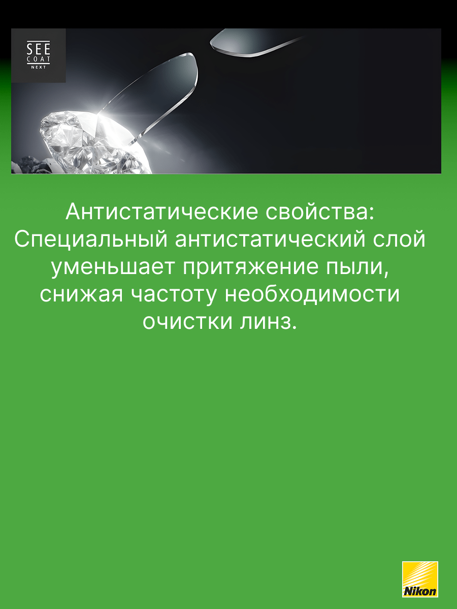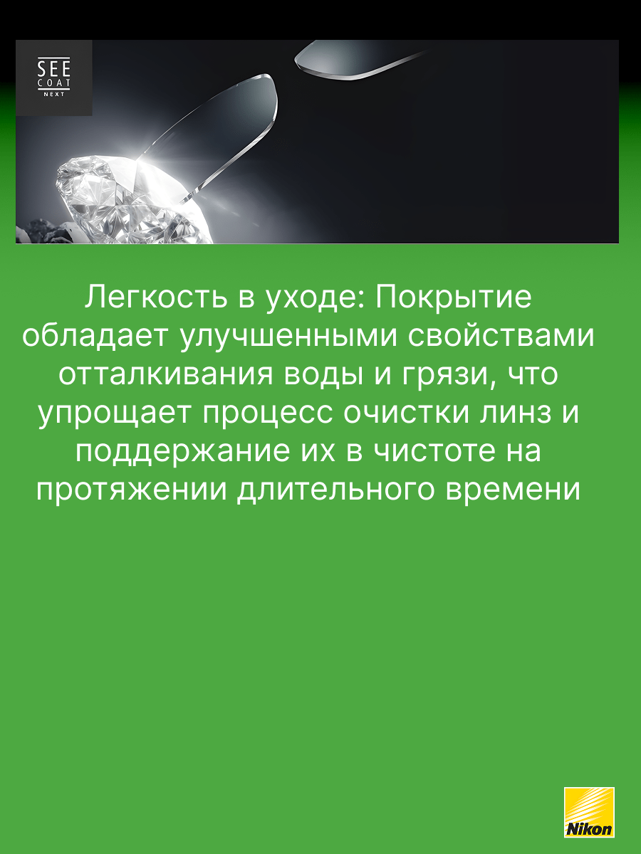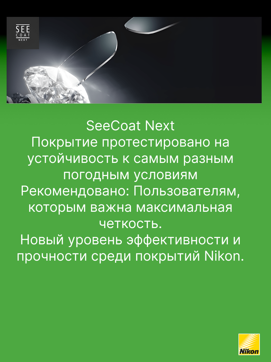 - SeeCoat Next от Nikon — это выбор для тех, кто ценит идеальную чистоту, высокой качество зрения и долговечность линз своих очков.