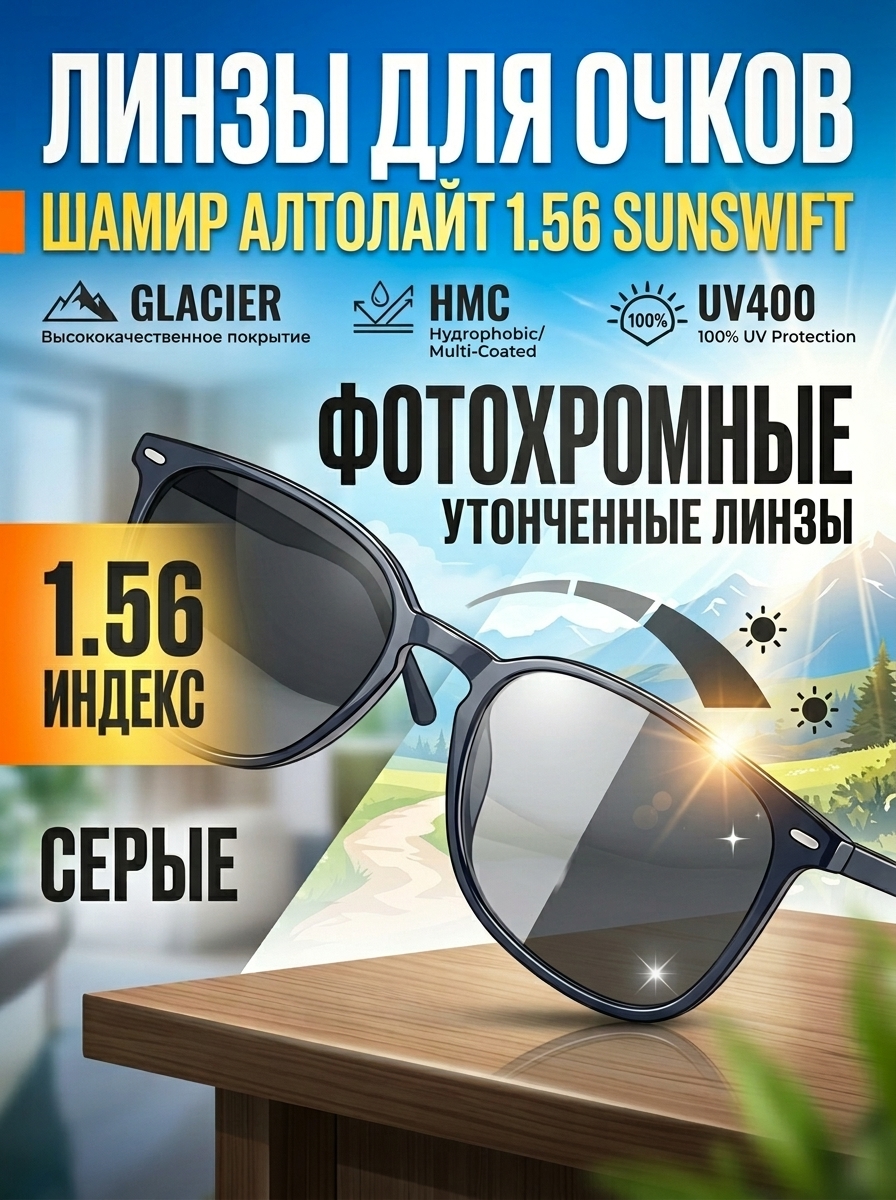 Shamir Altolite 1.56 SunSwift Glacier Grey — современные фотохромные линзы для очков, созданные для комфорта и защиты ваших глаз в любых условиях. В помещении и при низкой освещённости линзы полностью прозрачны и незаметны, а на ярком солнце мгновенно приобретают стильный серый оттенок, обеспечивая надёжную защиту и чёткое зрение.