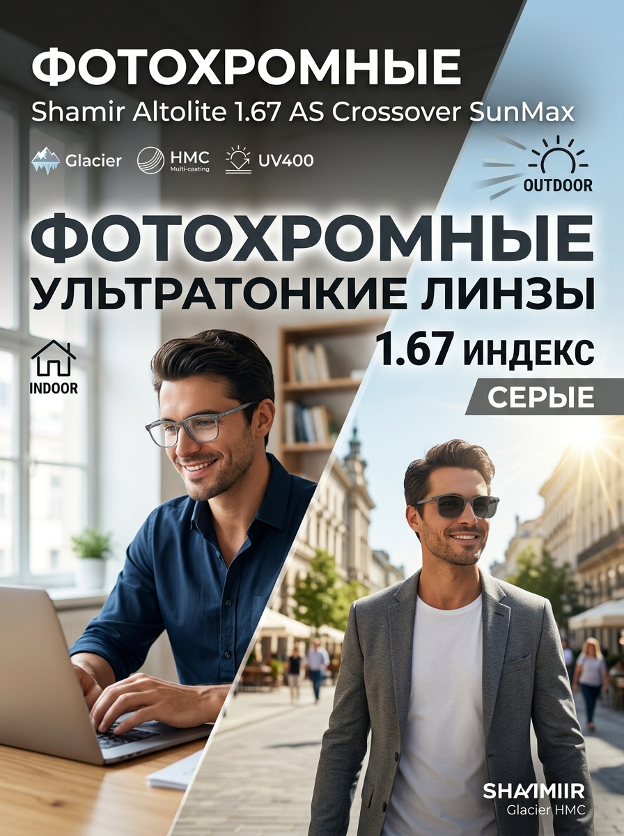 Однофокальные серые фотохромные линзы Shamir Altolite 1.67 AS Crossover SunMax Glacier Grey — это новейшее решение для тех, кто ценит комфорт, стиль и высокие технологии в каждой детали. Линзы оснащены инновационным покрытием Glacier, благодаря которому они мгновенно и автоматически приспосабливаются к разному уровню освещённости: в помещении и ночью они остаются абсолютно прозрачными, а на солнце моментально темнеют до стильного насыщенного серого цвета.